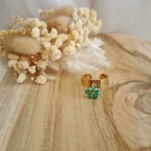 Craquez pour cette bague fine et féminine au design délicat. Son anneau ajustable en acier inoxydable doré accueille une jolie fleur composée de perles vertes lumineuses, apportant une touche de fraîcheur et d’élégance à votre tenue.