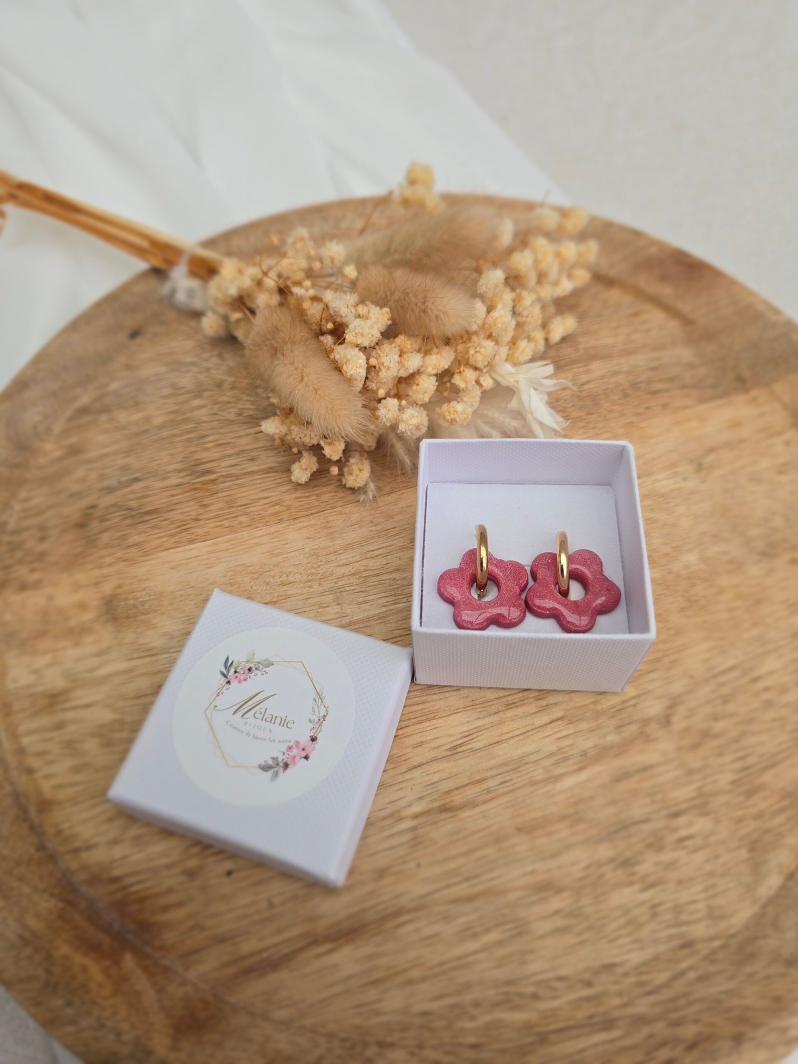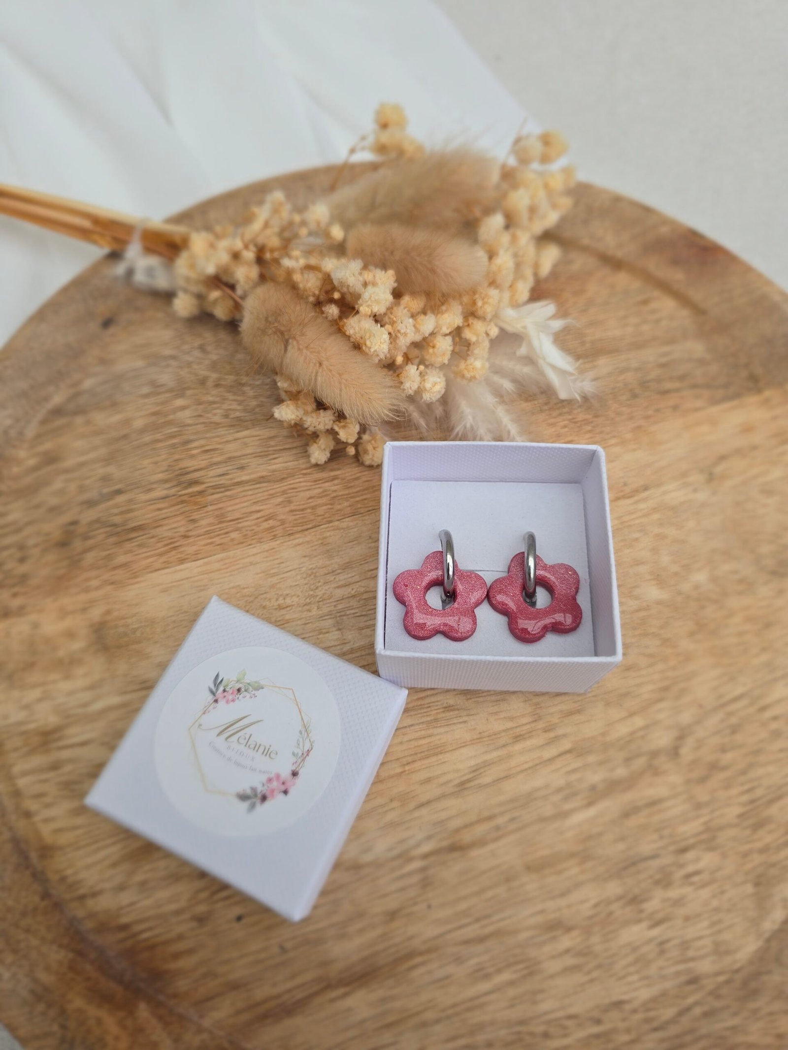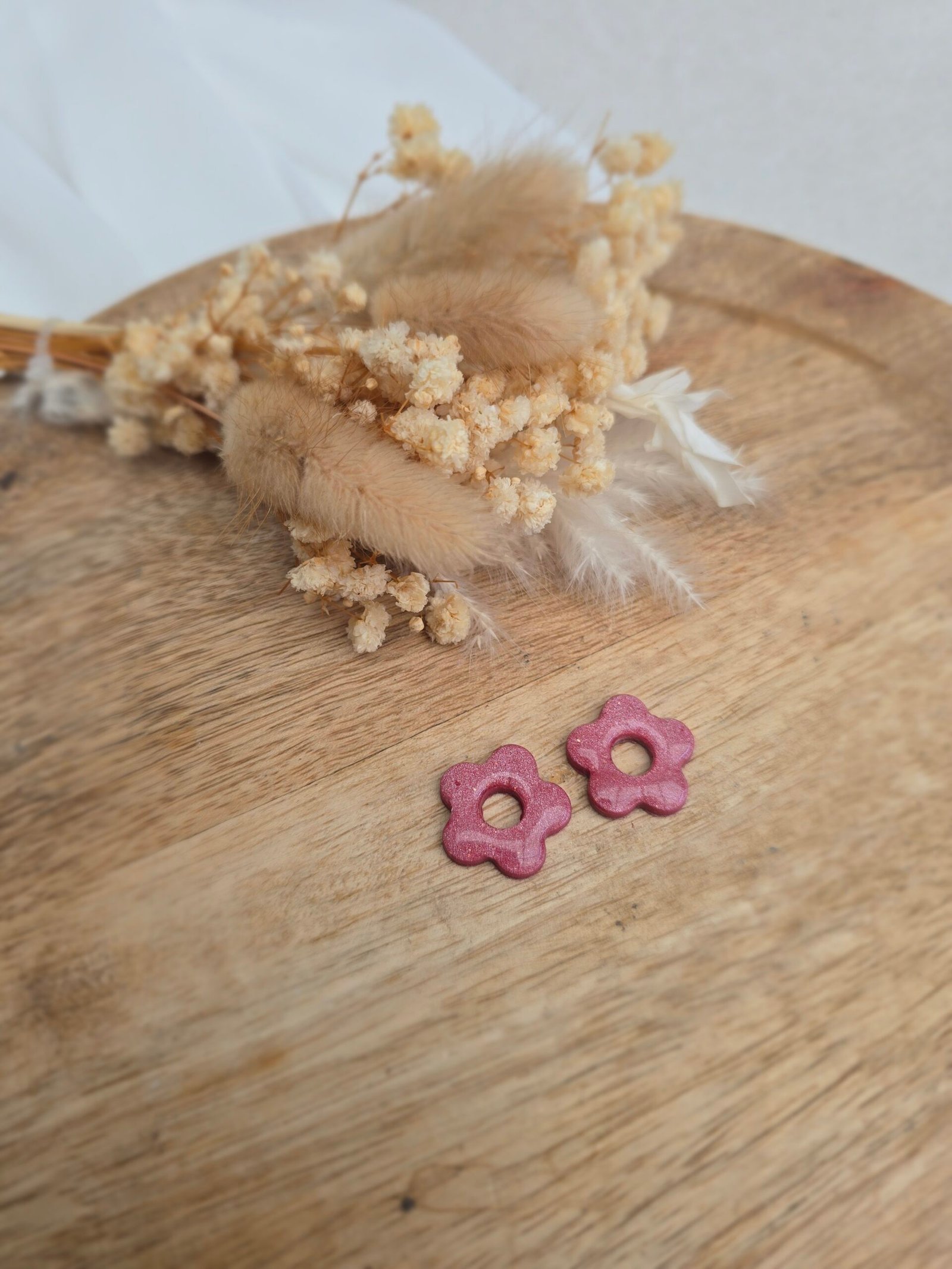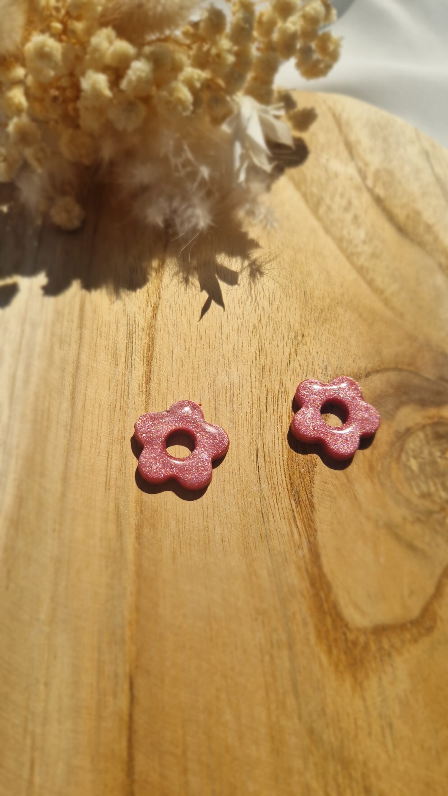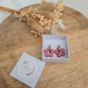 Les pampilles Léana sont de délicates fleurs en pâte Fimo, recouvertes d’une fine couche de résine brillante pour un rendu lumineux et élégant. Leur teinte rose pailleté apporte une touche douce, féminine et pétillante, parfaite pour personnaliser vos bijoux.