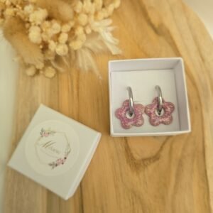 Les pampilles Léana se dévoilent ici dans une version éclatante et raffinée, sublimées par de délicates fleurs en pâte Fimo au charme irrésistible. Leur surface scintillante, parsemée de fines paillettes, capte la lumière avec douceur et met en valeur chaque détail du motif floral finement travaillé.