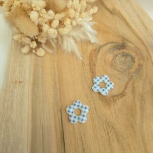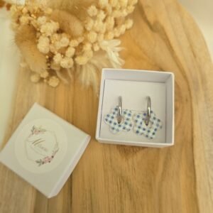 Les pampilles Léana se dévoilent ici dans une version tendre et pleine de fraîcheur, sublimées par de délicates fleurs en pâte Fimo au motif vichy délicatement dessiné. Leur imprimé à carreaux bleu et blanc évoque le charme des beaux jours, l’esprit campagne chic et la douceur d’un été ensoleillé.