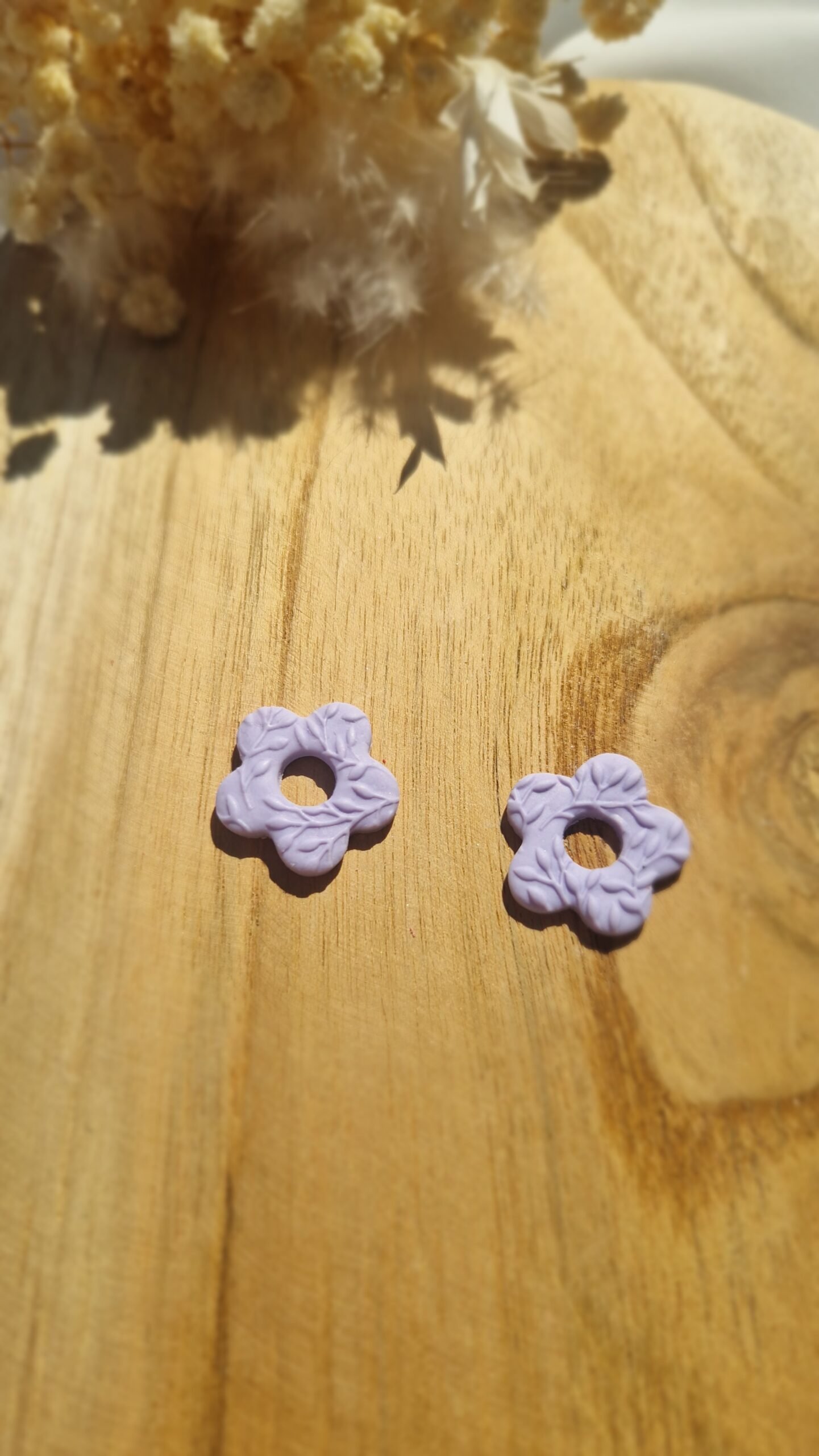Les pampilles Léana sont de délicates fleurs en pâte Fimo, sublimées par une texture en relief inspirée du lierre, évoquant des feuilles entrelacées et des pétales finement sculptés. Leur surface texturée et organique offre un rendu naturel, chaleureux et sophistiqué, avec un effet tactile unique.