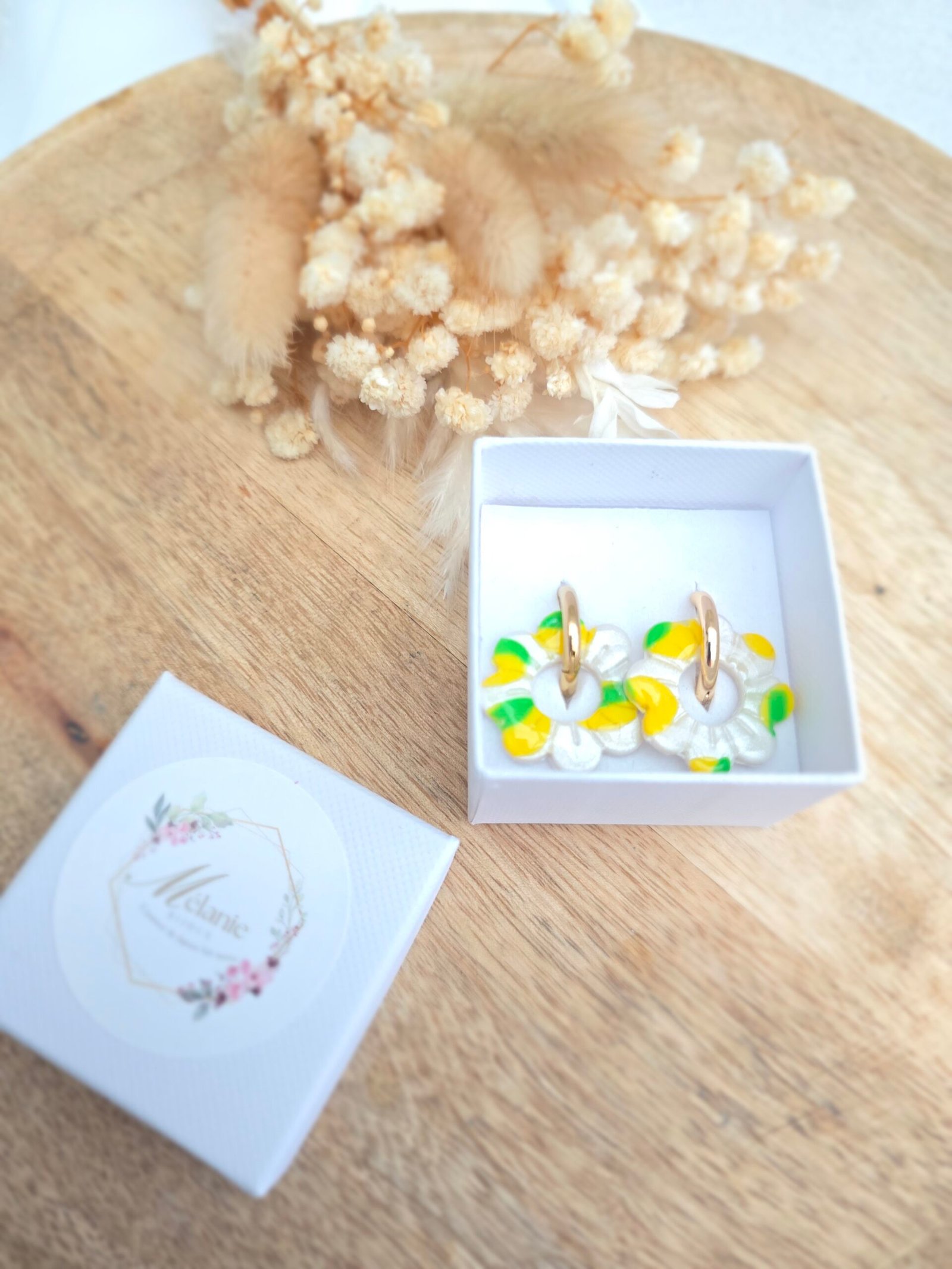 Les pampilles Serena Citron sont de jolies fleurs en pâte Fimo, aux pétales délicatement sculptés pour un rendu lumineux, frais et féminin. Leur teinte jaune citron éclatante apporte une touche vitaminée, joyeuse et moderne, parfaite pour illuminer vos créations.