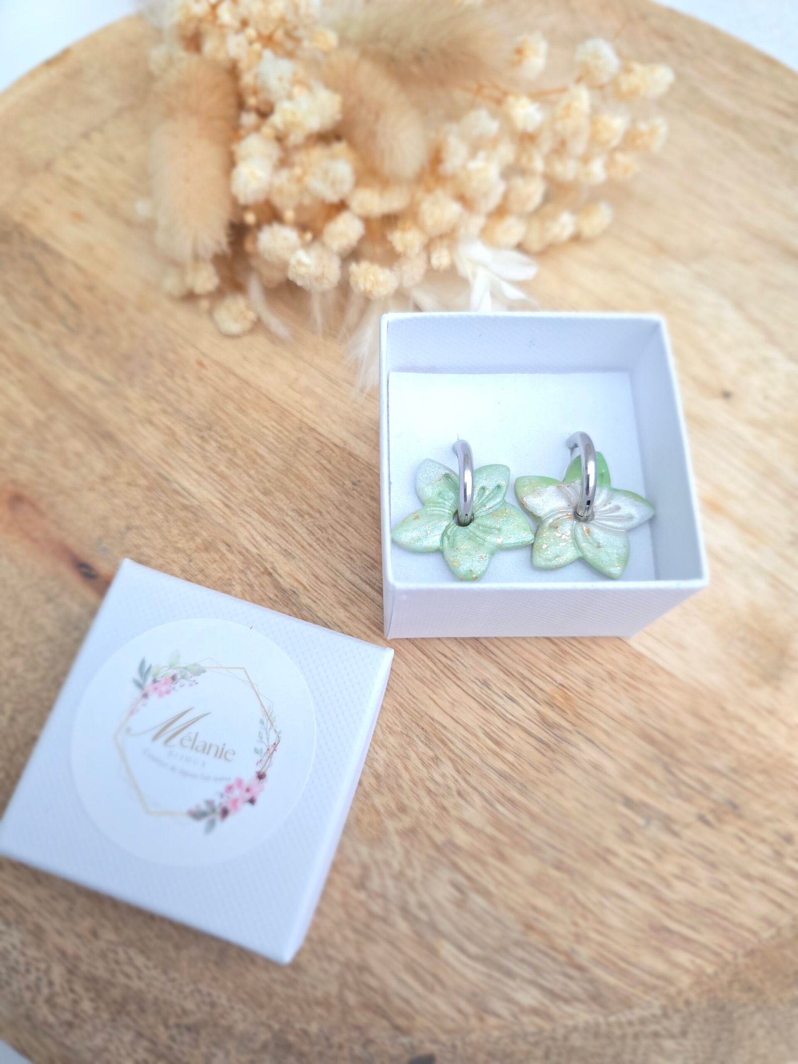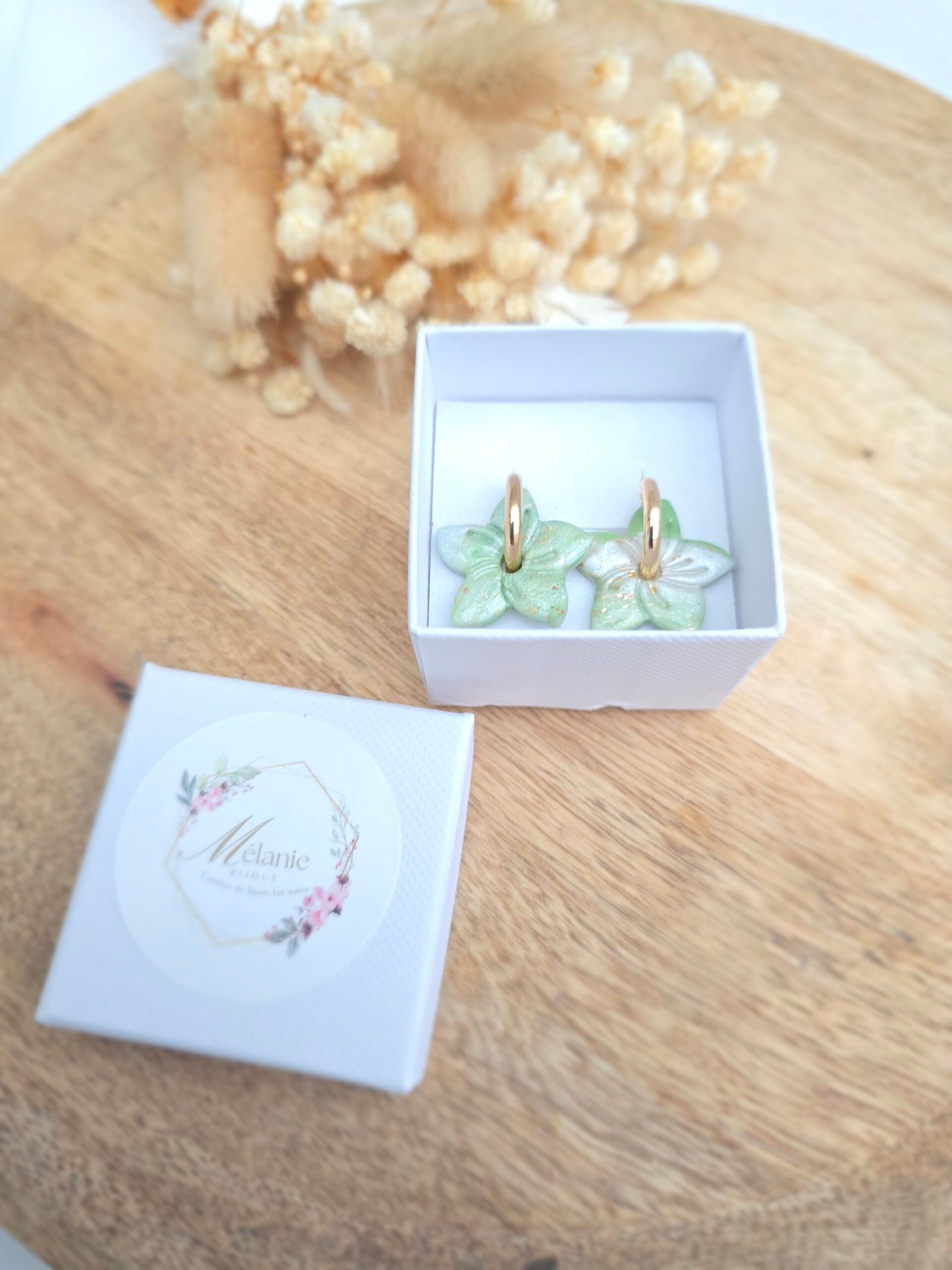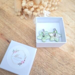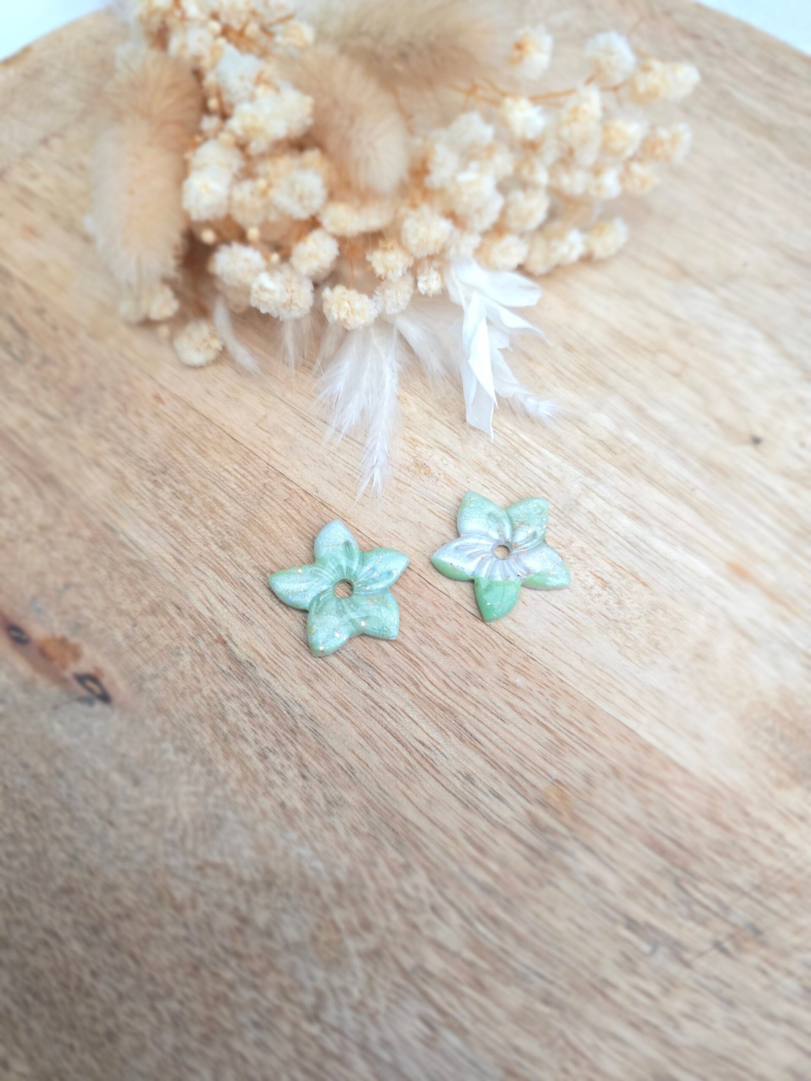 Les pampilles Stella Vert Sauge sont de délicates fleur en pâte Fimo, au design doux et moderne. Leur teinte vert sauge légèrement pailletée apporte une touche naturelle, apaisante et raffinée, idéale pour un style bohème et élégant.
